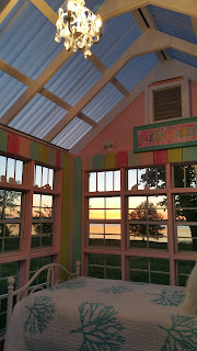 She is a kit, that was shipped from Ohio on a huge pallet. Too large to use the lift gate service of the truck. So my husband, me and the driver, hand unloaded the pieces.in 30 minutes!. The 12 ft. walls came in two sections, windows already in, the end pieces were each one piece with the door in place, and windows in place.The gable part of each end was separate, then there were many purlins and truss pieces. All the screws and hardware were included, YES the side pieces with the windows were heavy..but my husband and I are both 62, and the delivery driver was in his 50s.he was able to back right up to our garage...I was a little leary thinking I wouldn't be much help, I personaly would have a couple extra men help, but we live pretty isolated, and no one was handy. We chose not to buy the floor kit, my husband made ours with sanded plywood, a little thicker than their kit, but he built the floor like a deck, post in the ground, and stringers..then laid the plywood. You just have to make sure the floor is 8x12 for this kit.We laid the truss wood over one end pieces to use as a pattern, and quickly made all the trusses. Their instructions are very good.. The next day a neighbor in his 60;s came to help assemble.Oh how thankful we are to Chuck McGowan for helping us. His hard labor and brute strength got us thru this.. Don is strong too, but I am not, so I was not as much help. But I tried as hard as I could to help move and lift pieces.. We laid the heavy pieces over the truck rails of our pick up and drove them to the site in the yard.. OH so much less work.. backed up to the floor site, and walked the pieces in place..The sides went up fast, then they kept at it and we had Sides and trusses up by the end of the day..the next day the guys did the poly roof, and trim. Then I got to start priming and painting.. PINK of course and lots of trim paint.. MOST of the outside was primed..none of the inside was primed. We decided we wanted to insulate it, in hopes it would give us more use in winter. To make walls we used 5" cedar fence pickets. I sanded them, primed , then painted in chalk paint, and then sanded paint off in places to look weathered.. Don cut more pickets to use above and below the windows.. and we nail gunned them up in a random pattern..LOVE it..better than I expected.. I had thought of doing old shutters in all colors..but after a day of hitting junk stores..they wanted too much for them. This is better I think.I painted the floor, and did a pearl white metallic glaze on top. Let it cure a few days..and moved in the twin bed, got it online at Walmart. The mattress is super comfy, and it came from Wayfair , bed in a box, all compressed down,and open it up..and the memory foam fluffs up. The sheets have mermaids on them ! ( I found them at Ross) The quilt I got from Steinmart. The rug came from Ross also. The barrel wicker chairs, swivel and they came from TJMAX. super comfy..and we had room for 2. The pink trunk, I have had since 1970. It had been in a fire, and my Dad brought it to me thinking I might want it for a Hope Chest.. YES.. it worked great.. I had to clean it out and scrub it and de-smoke it..for years it was white with some gold trim..after I no longer needed a hope chest, I used it to store off season clothes..then a few years ago it was used to hold firewood, and I decoupaged old maps and painted it again.. The new life it has is for a coffee table.. stripped off all the old decoupage, new paint and stencils..Love it..I can never get rid of it.. My Dad was so thoughtful to think I might want it.The mermaid hanging on the dutch door is so cute.. I saw some in Florida and it took all I had in me from cutting the ropes off one and yanking it off a boat..But Don found her on Amazon.. Then we found one styrofoam crab trap bouy floating in the canal in FLorida and he bought more to go with them, and I painted them all bright and happy colors. Several different panels of curtains for a little privacy on busy weekends at the lake.. a few signs I had to have for the mermaid feel, some I already had..And of course she needed pink pearls. Found the retro style fan to help with a breeze...The blue and white anchor I have had for ever and fresh paint and some rope...done.. My bucket of shovels..I collect them each fall at the beach, I find them and keep them.. NO I do not yank them out of the kiddos hands... I wait till everyone has picked up for the day..and comb the beach. I knew from day one she had to have a chandelier... and love the glow it puts out. I already had the shutters for the window on the dutch door,I will have to find two more to replace the spot that I took these from in my hose... We put a little handle on the dutch door so I can just reach out and swing it open or shut. On the outside, the metal scroll pieces came from Hobby Lobby and I spray painted them, also the one in the center of the door as well.. I painted some 12x12 pavers to have a little spot for the two metal chairs.. We found them in a ditch all covered with brush and dirt and rust, I cleaned them up and primed, and painted them, then I used the new mod podge that is suppose to be waterproof and tolerate the dishwasher on top rack..so surely it can take some rain and hot sun..right?? I decoupaged napkins on the wood seats, Don had to cut wood rounds, since none had any seats..I used the stripe part of the napkin on the metal edge..and the floral part for seats.. I had a 3rd chair that the seat was all bent up, so we made it into a succulent planter.. The little life ring with Lil' Pink stenciled on it and decoupaged on, I had it already too.. and redid it..I sure hope this decoupage lasts like it says..time will tell..and spring rains...She needed party lights on the eaves to stand out in the night.. I am sure there will be more additions to Lil' Pink... but it is time to enjoy some spring days in her.. and relax.. I had no idea 96 sq. ft could take so much time painting and decorating.. We s